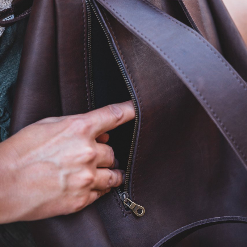 - Two outside pockets, one on the back and one on the front, with metal zips