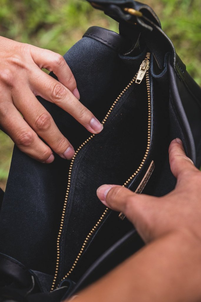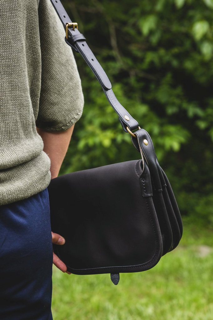 - Adjustable shoulder strap in thick saddlery leather with saddle stitching on the sides