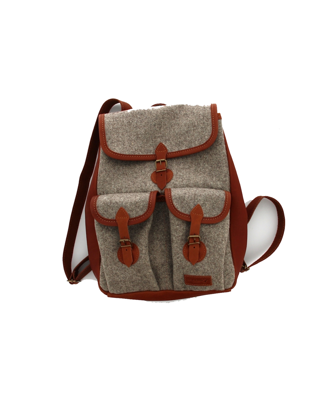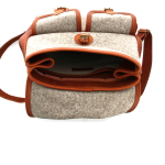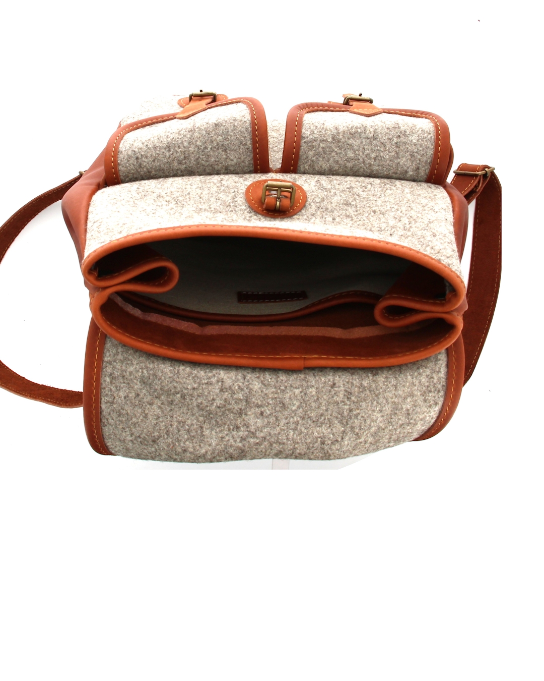 - Bag closes with flap, buckle and leather tongue